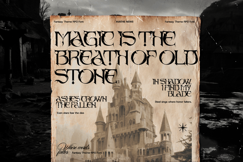 AVATHE is a bold and mystical serif font inspired by dark fantasy, medieval lore, and RPG aesthetics. With razor-sharp details and high-contrast strokes, it’s made for creators who want to build worlds, summon atmosphere, and make their work unforgettable.
