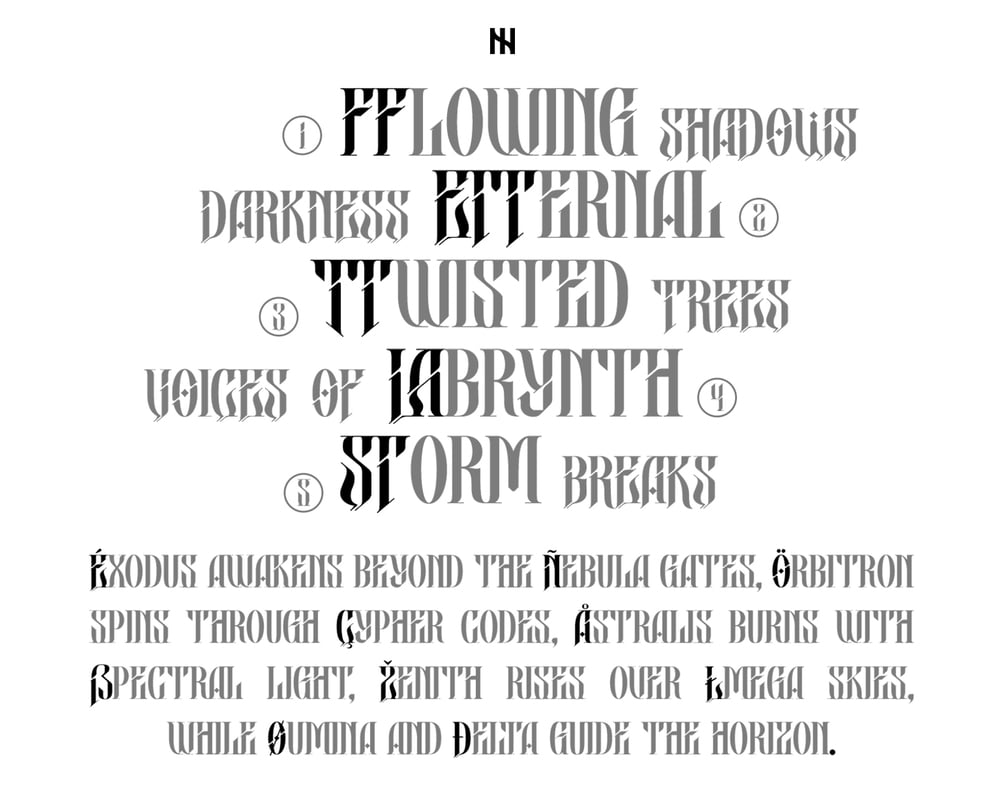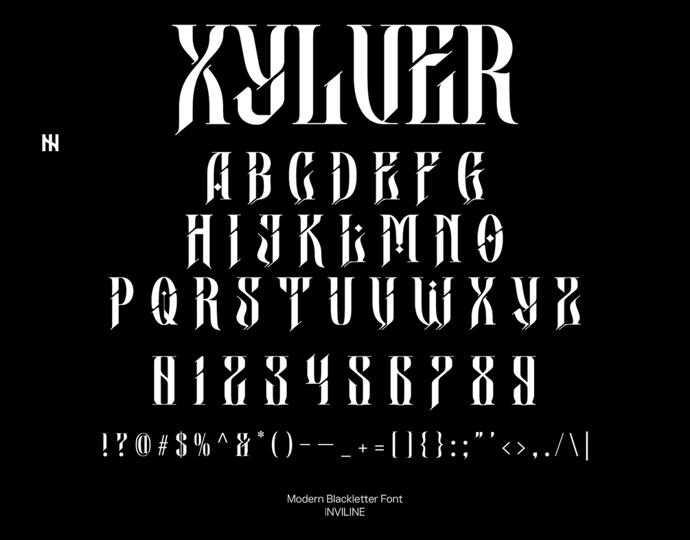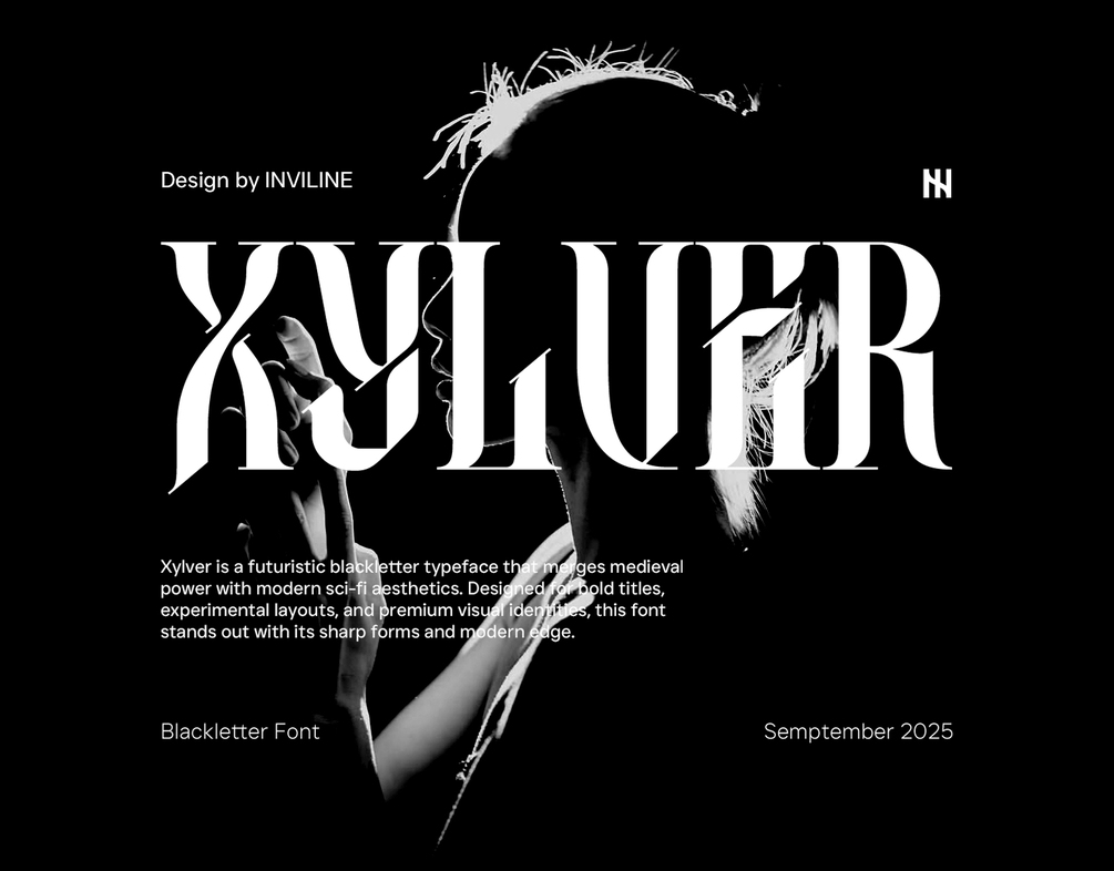 Xylver is a futuristic blackletter font that blends gothic traditions with a modern, sci-fi twist. Its bold strokes, sharp edges, and experimental forms create a striking typographic style—perfect for album covers, posters, streetwear branding, techno music visuals, cyber-gothic aesthetics, and projects that demand a dark yet innovative edge.